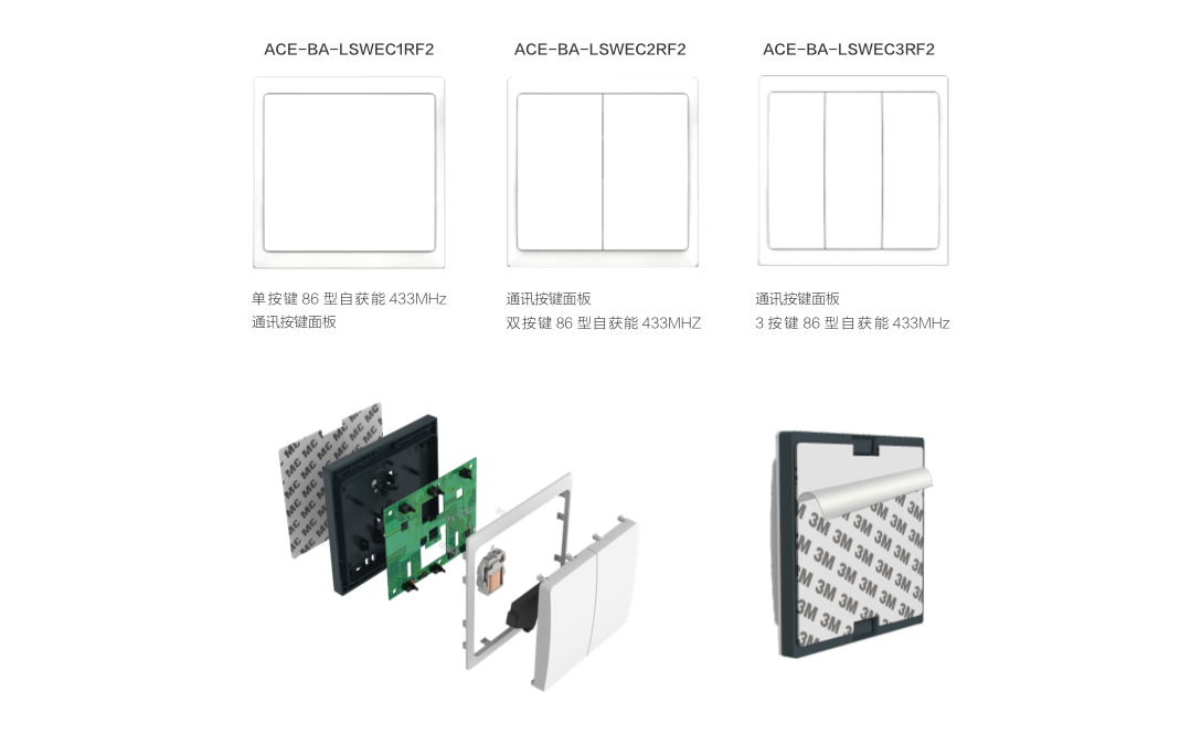自獲能開關面板為標準86開關面板,此系列產品共三款:分別為單開面板、雙開面板和三開面板;自獲能開關面板可通過自發電裝置自主供電并發射433MHz無線信號,無需外部供電;此產品安裝便捷,可按照傳統的安裝方式安裝在86盒內,也可使用3M膠粘貼安裝系列產品可配合燈控或其它433MHz接收設備使用