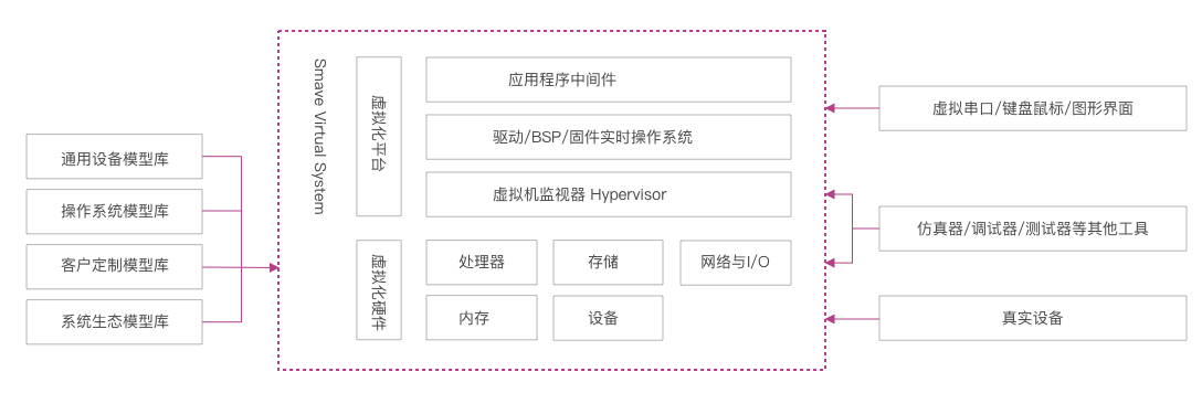 SMAVE Virtual System可將被測軟件執(zhí)行過程與原始硬件環(huán)境脫離,在時(shí)間和空間上減少了對硬件環(huán)境的依賴,通過將軟件虛擬化設(shè)計(jì)與驗(yàn)證平臺部署在不同的機(jī)器上可有助于并行開展測試任務(wù)、及時(shí)快速的發(fā)現(xiàn)并定位問題。
